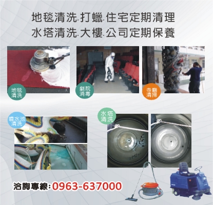 環境消毒病媒防治、地板打蠟、地毯清洗、水塔清洗、高壓清洗、庭院除草、淹水後清理、住宅定期清潔打掃、大樓定期保養、公司定期保養、交屋清潔、裝潢清潔、熱煙霧機、高壓噴霧機、消毒機、清洗機、洗地機、掃地機、吸塵器、乾式吸塵器、採光罩清洗、噴水池清洗、排油煙機清洗、封地臘、地板保護劑、清潔、斗六清潔、雲林清潔、居家打掃、居家消毒、居家清潔